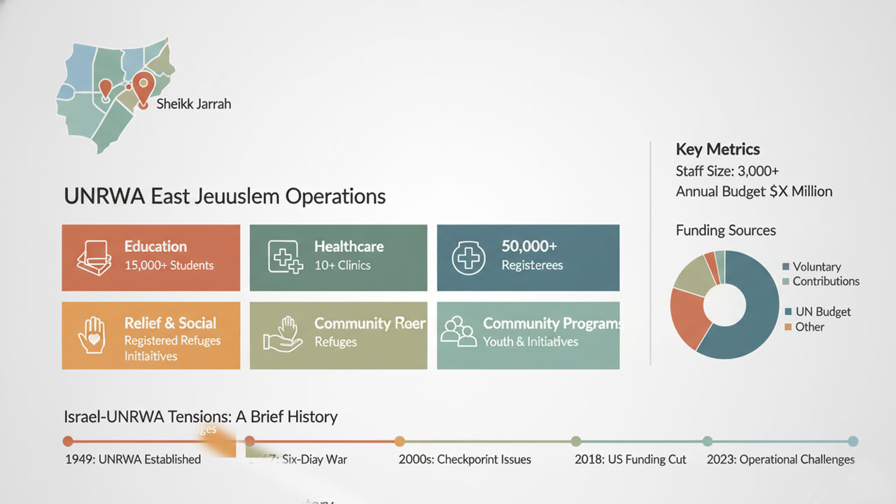 Sheikh Jarrah, located in East Jerusalem, has become a focal point of Israeli-Palestinian tensions, particularly over property rights and eviction disputes. The UNRWA compound in the area serves both as an administrative hub and a symbol of international humanitarian presence.