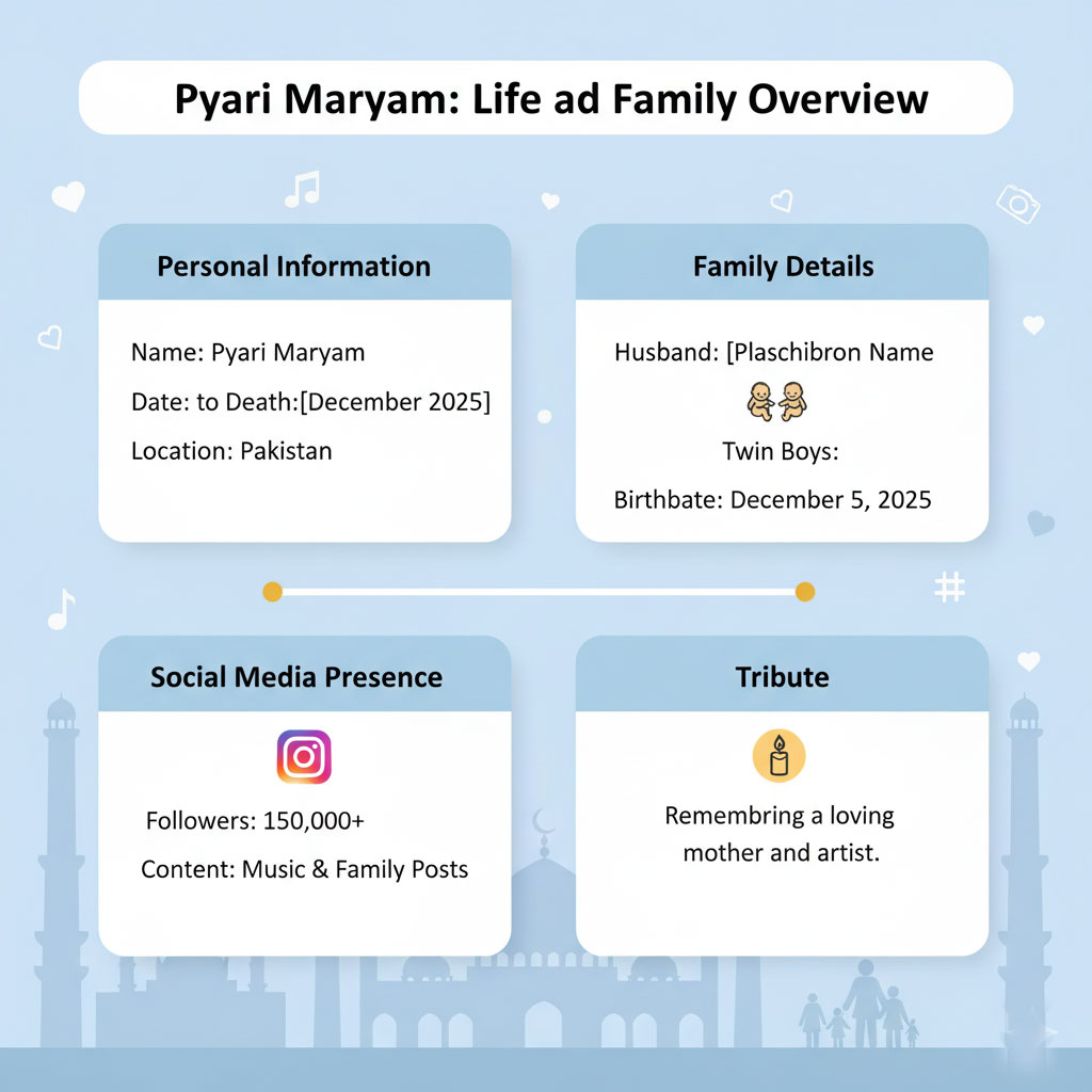 - Confirmed Facts: Pyari Maryam died on December 5, 2025, in Pakistan, shortly after giving birth to twin boys.