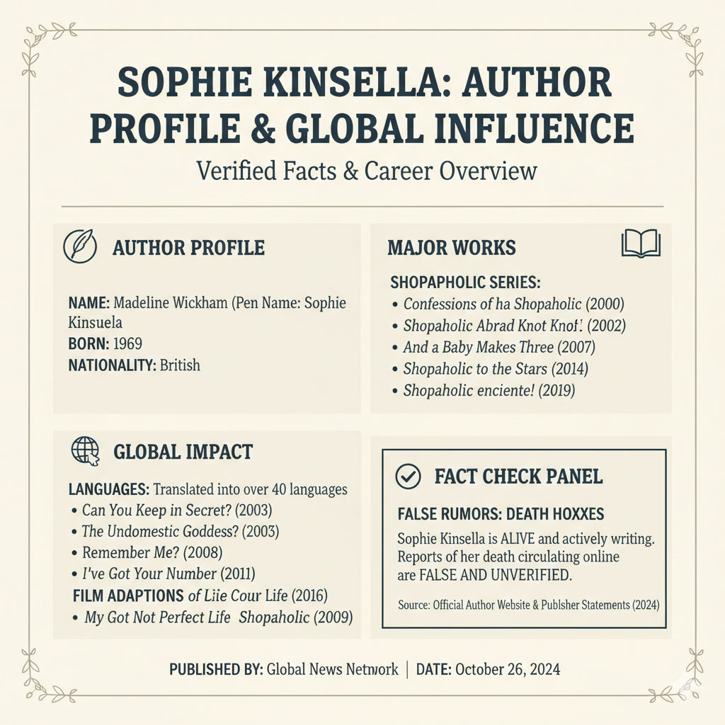 No reputable news organization, including major British or international outlets, has confirmed the death of Sophie Kinsella. Her publishers and professional affiliations have issued no statements suggesting such an event, reinforcing the conclusion that the reports are unfounded.